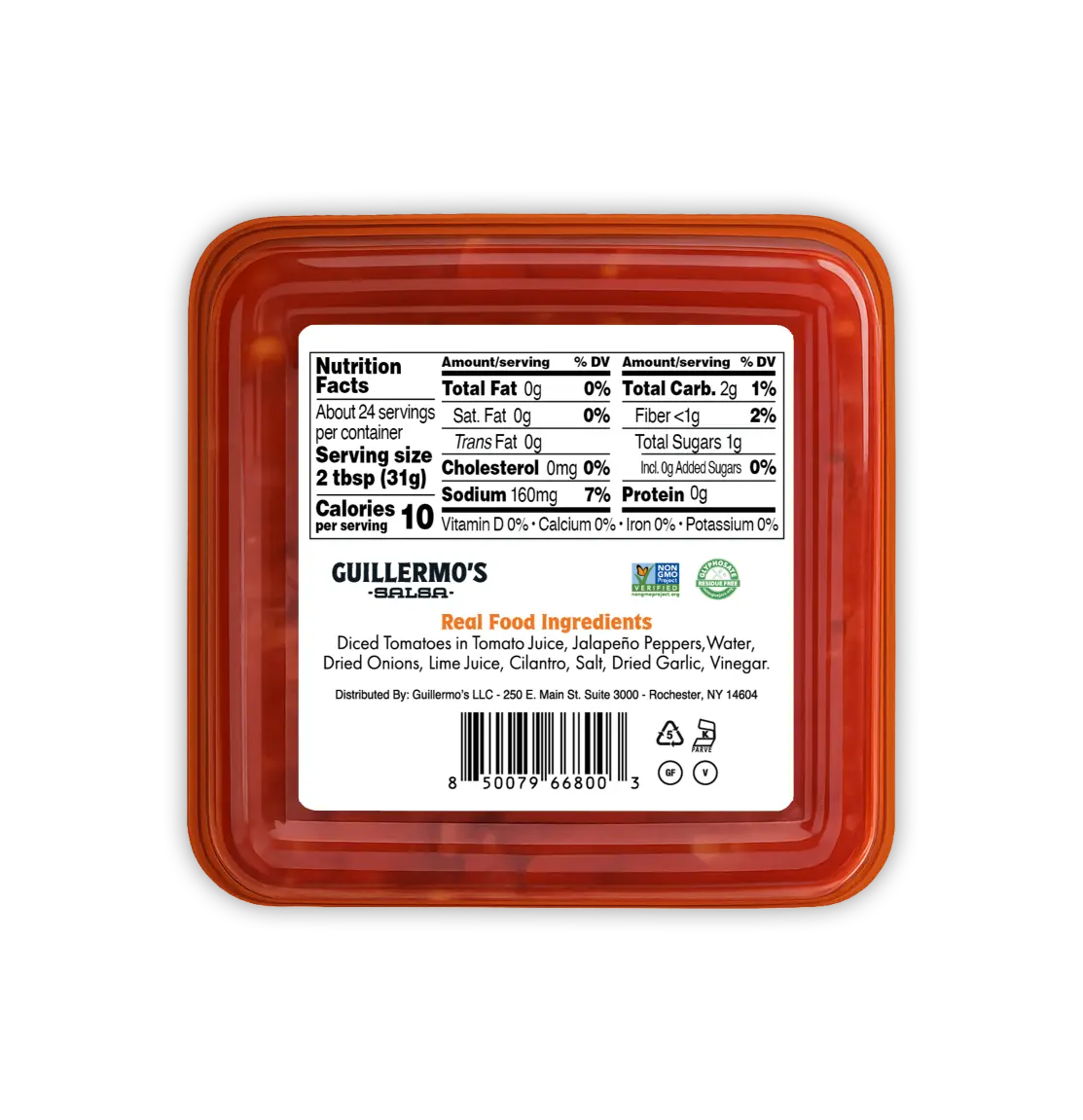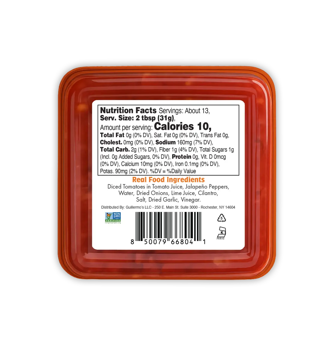 Diced Tomatoes in Tomato Juice, Jalapeño Peppers, Water, Dried Onions, Lime Juice, Cilantro, Salt, Dried Garlic, Vinegar.