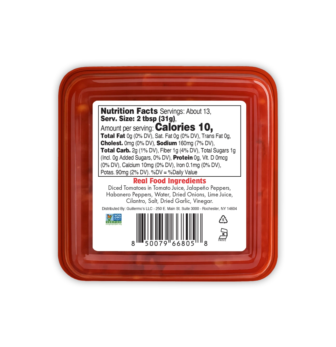 Diced Tomatoes in Tomato Juice, Peppers (Jalapeño, Habanero), Water, Dried Onions, Lime Juice, Cilantro, Salt, Dried Garlic, Vinegar.